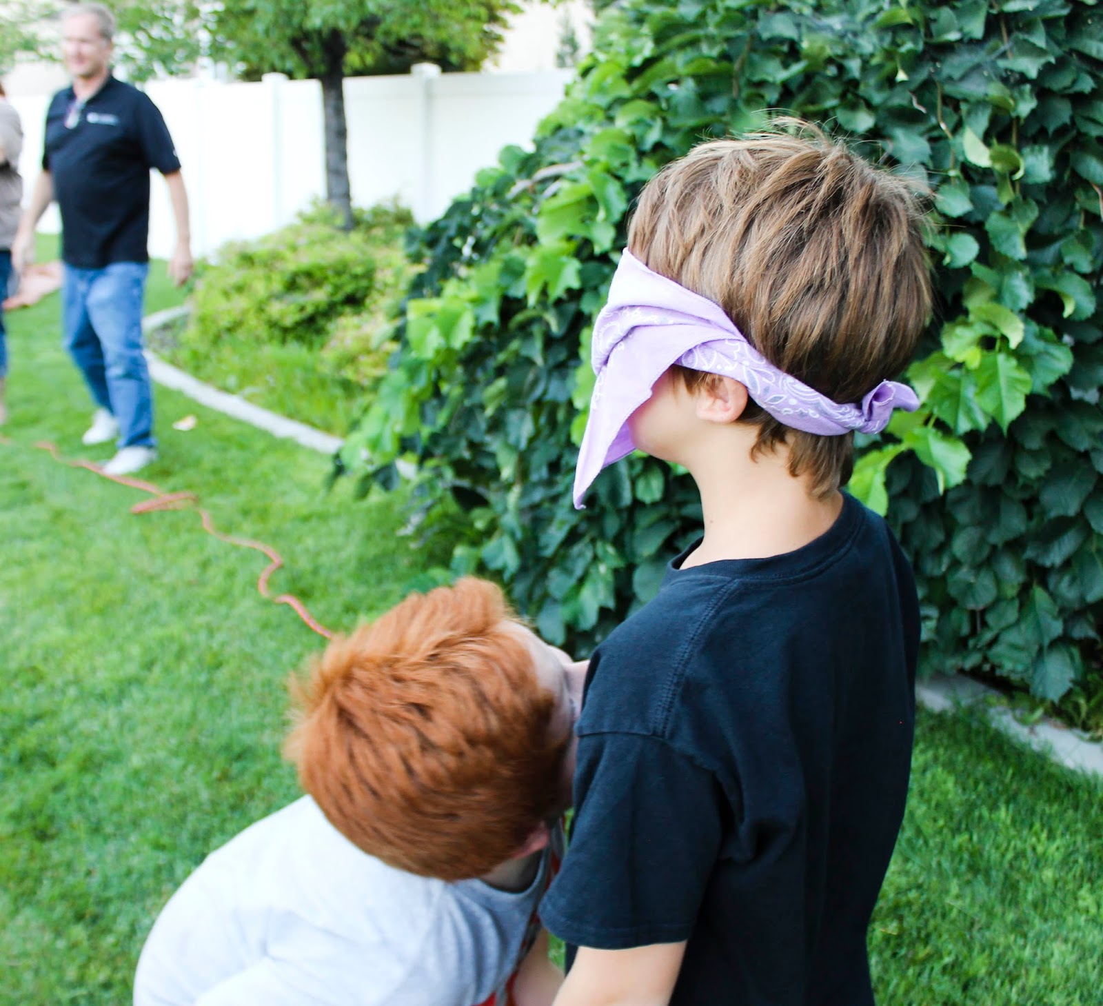 After swimming, we all went over to Christopher and Tysen's. We prepared a delicious fajita dinner with chips, salsa, and guacamole, as well as fruit. We pitched tents and got our sleeping situation sorted, then played a game. We had played it at Heber Valley Camp when we were there last year, and it was really fun. You have a partner. One partner goes into the middle of the circle blindfolded. That person is trying to avoid being bopped by a blindfolded person with a noodle. The other partner is outside the circle calling in directions to you to tell you how to avoid being bopped, while the bopper's partner is calling directions to help them find someone to whack. We laughed a lot. Some of us cheated (not to name names, but a habitual peeker lives at our house and has a pink bedroom).