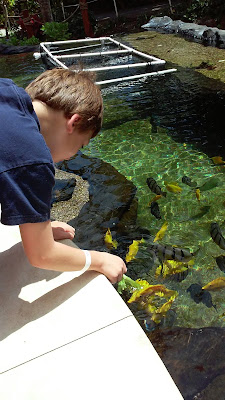 We spent the rest of the morning and into the afternoon at Sea Life Park, a marine mammal park, bird sanctuary, and aquarium not far from Brenda's house. In fact, it is just past Makapu'u. It's a small park, but we saw really interesting things, the park wasn't too crowded, and the two shows we saw were fun. The kids loved it. There was a large shark tank as we walked in where we saw hammerhead sharks. We went to a sea lion show and learned about the differences between sea lions and seals. We saw sea turtles mating (Hey, hey! Kids! Cover your eyes!), fed yellow tangs and petted a baby sea turtle, watched a dolphin show, had a close encounter with a penguin named Almond Joy (AJ for short), and learned all about the resident monk seal Lamb Chop. We got to feed small, colorful birds that ate Kent's hat and sat on Brandt's head, and waited so, so long for lunch. It was all super fun! Look at all these pictures that prove it.