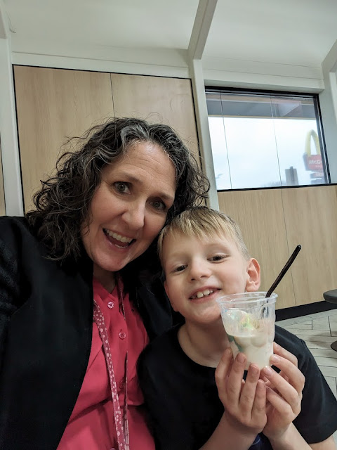 Mr. Kal, our Dreamy Boyfriend, is seven today. Time passes too quickly. Just like last week he was a tiny baby we were all snuggling. Now he's a big boy who will still snuggle, but he's bigger. I got to have a birthday lunch date with him, and we went his favorite spot, McDonalds. Oh boy! He helped order his lunch, he played on the indoor equipment with a younger boy who was there, and he got free ice cream because it was his special day. A special day for a special boy. I love Kal and was happy I could celebrate with him.