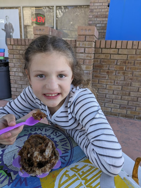 It's warming up. A sure sign that summer is right around the corner is the appearance of the Hokulia. On our way to get a treat after The Tempest, we saw that it was open and stopped to have our first shaved ice of the season. There was only one guy working, taking orders, shaving ice, pouring syrup, and distributing cups. They needed three people working and we waited a long time for our shaved ice. I suggested to Brandt that he apply to work there. Izzy too. He didn't seem very interested. When we finally got them, the shaved ice was delicious!